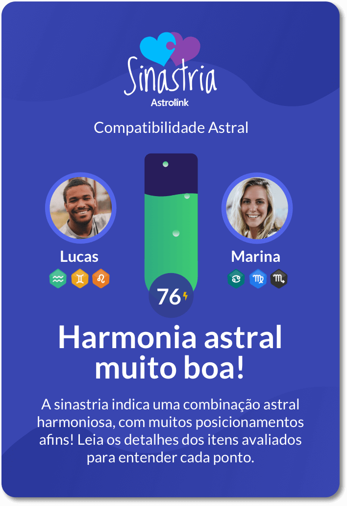 Jede Kombination zwischen zwei Horoskopen hat ein einzigartiges und personalisiertes Ergebnis! Erhalte eine detaillierte Analyse mit Informationen zur astralen Harmonie, grundlegenden Affinitäten, Energievergleich, Beziehungsbereichen und vielem mehr!